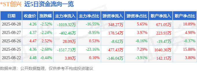 证券之星消息,截至2025年8月28日收盘,*ST创兴(600193)报收于4.26元,下跌2.52%,换手率3.4%,成交量14.45万手,成交额6159.35万元。