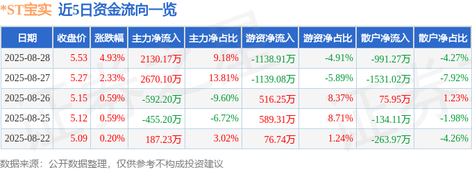 证券之星消息,截至2025年8月28日收盘,*ST宝实(000595)报收于5.53元,上涨4.93%,换手率3.71%,成交量42.2万手,成交额2.32亿元。
