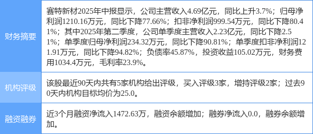 今日赛特新材(688398)涨5.45%,收盘报23.8元。