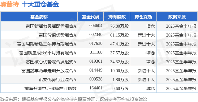 根据2025基金半年报公募基金重仓股数据,重仓该股的公募基金共8家,其中持有数量最多的公募基金为富国基金的富国新活力灵活配置混合A。富国新活力灵活配置混合A目前规模为3.79亿元,最新净值3.2136(8月27日),较上一交易日下跌3.34%,近一年上涨72.19%。该公募基金现任基金经理为吴栋栋。吴栋栋在任的基金产品包括:富国质量成长6个月持有混合A,管理时间为2022年2月28日至今,期间收益率为42.38%;富国核心优势混合发起式A,管理时间为2023年12月1日至今,期间收益率为78.59%。