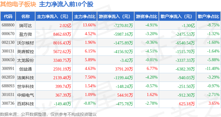 从资金流向上来看,当日其他电子板块主力资金净流出4.28亿元,游资资金净流出2.2亿元,散户资金净流入6.48亿元。其他电子板块个股资金流向见下表: