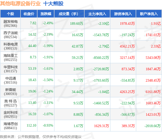 个股表现方面,其他电源设备行业当日领跌股为融发核电(002366),该股当日报收7.82,下跌2.49%,成交量189.6万,主力资金净流出2.1亿元。西子洁能(002534)以下跌2.19%紧随其后,该股当日成交量16.65万,主力资金净流出1543.78万元。除此之外,科泰电源(300153)、海陆重工(002255)、华塑科技(301157)均进入当日熊股之列。具体个股列表见下表: