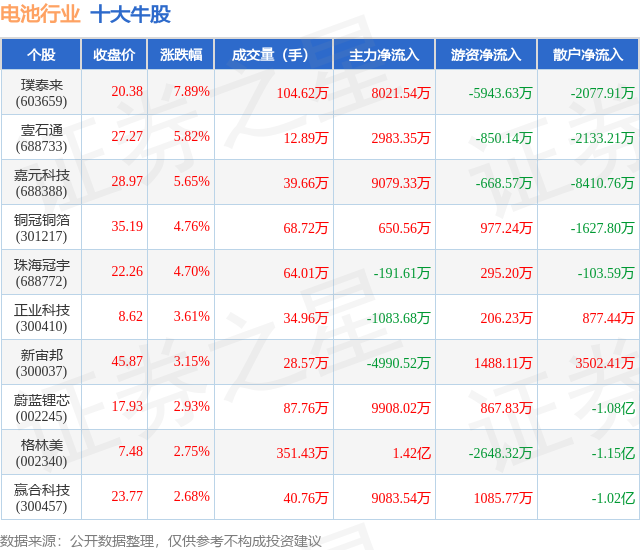 个股表现方面,电池行业当日领涨股为璞泰来(603659),该股当日报收20.38,上涨7.89%,成交量104.62万,主力资金净流入8021.54万元。壹石通(688733)以上涨5.82%紧随其后,该股当日成交量12.89万,主力资金净流入2983.35万元。除此之外,嘉元科技(688388)、铜冠铜箔(301217)、珠海冠宇(688772)均进入当日牛股之列。具体个股列表见下表:
