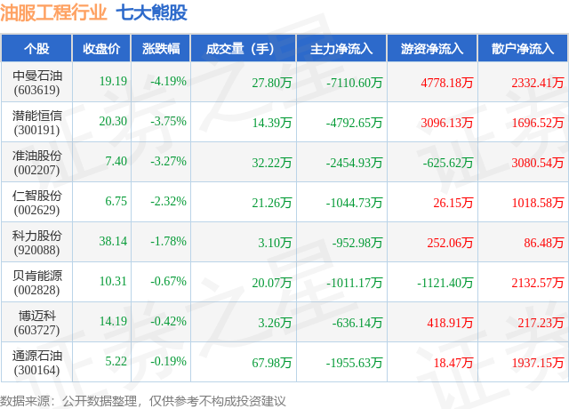 个股表现方面,油服工程行业当日领跌股为中曼石油(603619),该股当日报收19.19,下跌4.19%,成交量27.8万,主力资金净流出7110.6万元。潜能恒信(300191)以下跌3.75%紧随其后,该股当日成交量14.39万,主力资金净流出4792.65万元。除此之外,准油股份(002207)、仁智股份(002629)、科力股份(920088)均进入当日熊股之列。具体个股列表见下表: