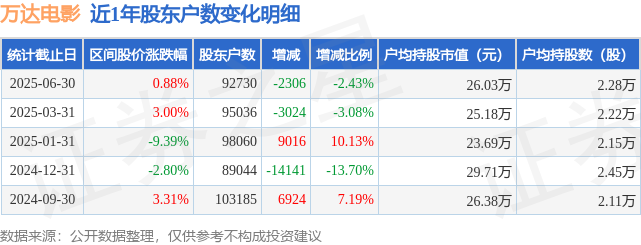 从股价来看,2025年3月31日至2025年6月30日,万达电影区间涨幅为0.88%,在此期间股东户数减少2306.0户,减幅为2.43%。