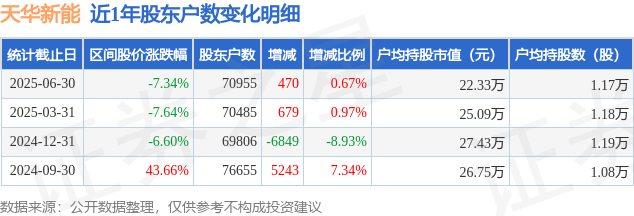 从股价来看,2025年3月31日至2025年6月30日,天华新能区间跌幅为7.34%,在此期间股东户数增加470.0户,增幅为0.67%。