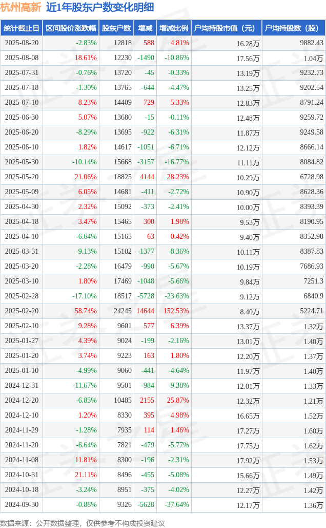 从股价来看,2025年8月8日至2025年8月20日,杭州高新区间跌幅为2.83%,在此期间股东户数增加588.0户,增幅为4.81%。