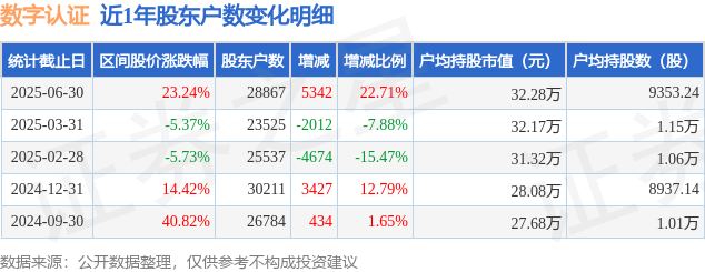 从股价来看,2025年3月31日至2025年6月30日,数字认证区间涨幅为23.24%,在此期间股东户数增加5342.0户,增幅为22.71%。