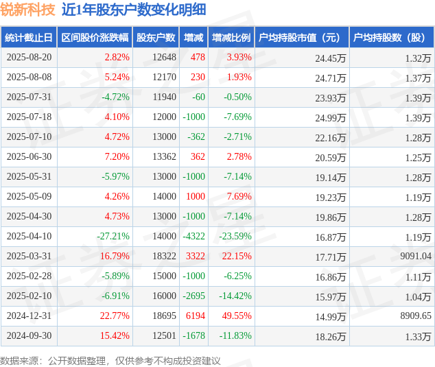 从股价来看,2025年8月8日至2025年8月20日,锐新科技区间涨幅为2.82%,在此期间股东户数增加478.0户,增幅为3.93%。