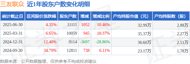 从股价来看,2025年3月31日至2025年6月30日,三友联众区间涨幅为4.35%,在此期间股东户数增加1052.0户,增幅为10.46%。