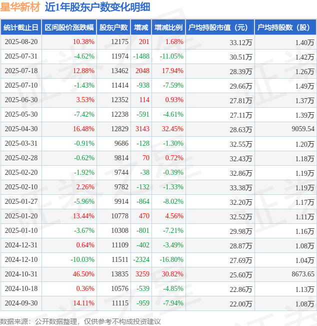从股价来看,2025年7月31日至2025年8月20日,星华新材区间涨幅为10.38%,在此期间股东户数增加201.0户,增幅为1.68%。