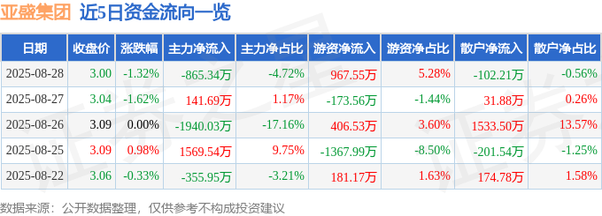 证券之星消息,截至2025年8月28日收盘,亚盛集团(600108)报收于3.0元,下跌1.32%,换手率3.13%,成交量60.97万手,成交额1.83亿元。