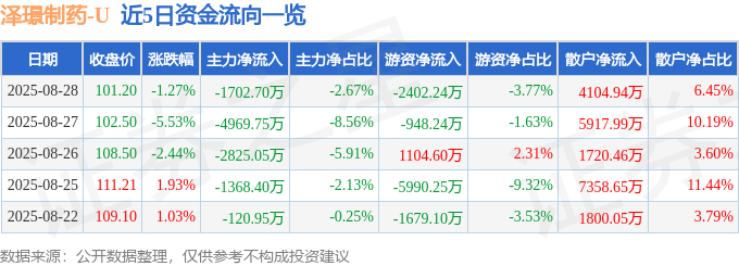 证券之星消息,截至2025年8月28日收盘,泽璟制药(688266)报收于101.2元,下跌1.27%,换手率2.41%,成交量6.38万手,成交额6.37亿元。