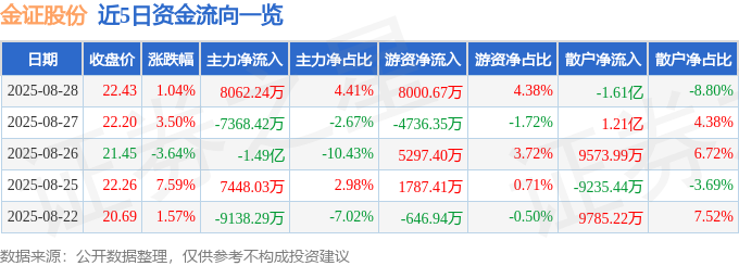 证券之星消息,截至2025年8月28日收盘,金证股份(600446)报收于22.43元,上涨1.04%,换手率8.78%,成交量82.66万手,成交额18.26亿元。