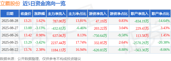 证券之星消息,截至2025年8月28日收盘,立霸股份(603519)报收于13.21元,上涨1.62%,换手率1.63%,成交量4.35万手,成交额5697.37万元。