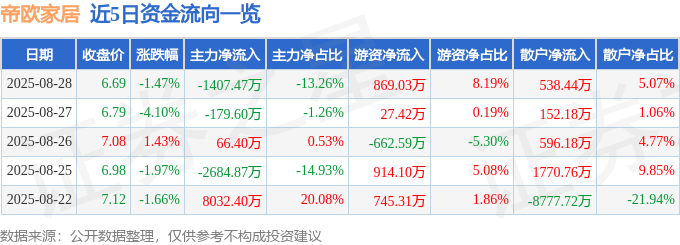 证券之星消息,截至2025年8月28日收盘,帝欧家居(002798)报收于6.69元,下跌1.47%,换手率3.63%,成交量15.89万手,成交额1.06亿元。