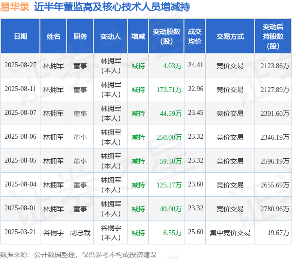 易华录近半年内的董监高及核心技术人员增减持详情如下: