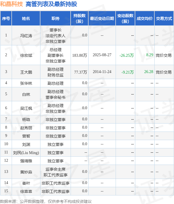和晶科技近半年内的董监高及核心技术人员增减持详情如下: