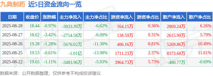 证券之星消息,截至2025年8月28日收盘,九典制药(300705)报收于18.44元,下跌0.97%,换手率6.78%,成交量25.07万手,成交额4.58亿元。