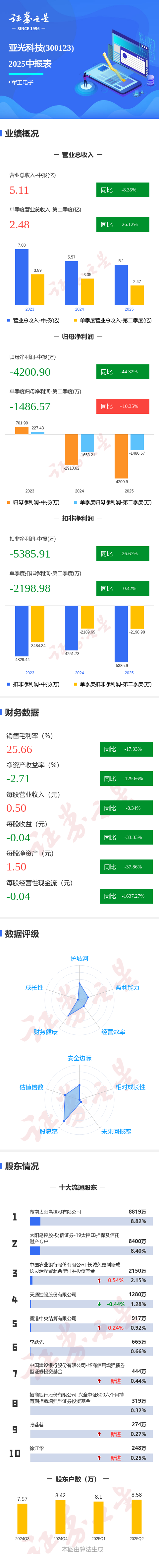 证券之星消息,亚光科技2025年中报显示,公司主营收入5.11亿元,同比下降8.35%;归母净利润-4200.9万元,同比下降44.33%;扣非净利润-5385.91万元,同比下降26.68%;其中2025年第二季度,公司单季度主营收入2.48亿元,同比下降26.13%;单季度归母净利润-1486.57万元,同比上升10.35%;单季度扣非净利润-2198.98万元,同比下降0.42%;负债率65.57%,投资收益440.43万元,财务费用7071.2万元,毛利率25.66%。