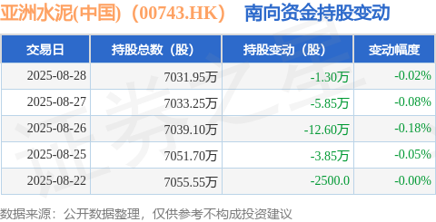证券之星消息,8月28日南向资金减持1.3万股亚洲水泥(中国)(00743.HK)。近5个交易日中,获南向资金减持的有5天,累计净减持23.85万股。近20个交易日中,获南向资金减持的有20天,累计净减持204.15万股。截至目前,南向资金持有亚洲水泥(中国)(00743.HK)7031.95万股,占公司已发行普通股的4.47%。