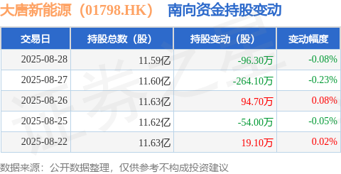 证券之星消息,8月28日南向资金减持96.3万股大唐新能源(01798.HK)。近5个交易日中,获南向资金减持的有3天,累计净减持300.6万股。近20个交易日中,获南向资金增持的有11天,累计净增持325.0万股。截至目前,南向资金持有大唐新能源(01798.HK)11.59亿股,占公司已发行普通股的46.35%。