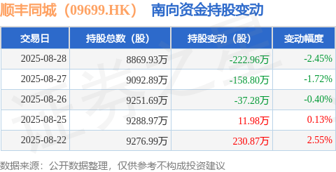 证券之星消息,8月28日南向资金减持222.96万股顺丰同城(09699.HK)。近5个交易日中,获南向资金减持的有3天,累计净减持176.19万股。近20个交易日中,获南向资金增持的有10天,累计净增持41.09万股。截至目前,南向资金持有顺丰同城(09699.HK)8869.93万股,占公司已发行普通股的11.89%。