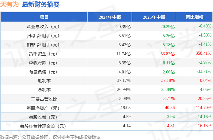 据证券之星公开数据整理,近期天有为(603202)发布2025年中报。截至本报告期末,公司营业总收入20.29亿元,同比下降0.49%,归母净利润5.26亿元,同比下降4.5%。按单季度数据看,第二季度营业总收入9.87亿元,同比下降10.59%,第二季度归母净利润2.86亿元,同比下降10.77%。本报告期天有为公司应收账款体量较大,当期应收账款占最新年报归母净利润比达71.33%。