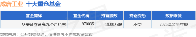 持有威唐工业最多的基金为华安证券合赢九个月持有,目前规模为3.58亿元,最新净值1.1229(8月27日),较上一交易日下跌0.38%,近一年上涨4.91%。该基金现任基金经理为张欣 张钰 刘杰。