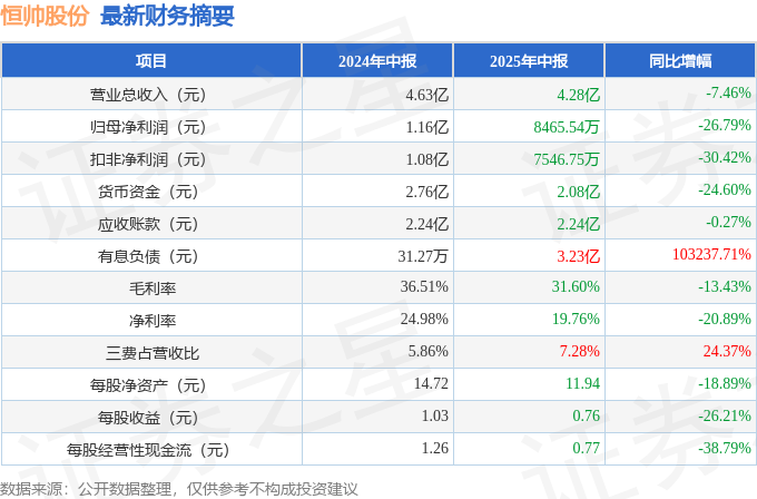 据证券之星公开数据整理,近期恒帅股份(300969)发布2025年中报。截至本报告期末,公司营业总收入4.28亿元,同比下降7.46%,归母净利润8465.54万元,同比下降26.79%。按单季度数据看,第二季度营业总收入2.26亿元,同比上升1.92%,第二季度归母净利润4285.46万元,同比下降15.72%。本报告期恒帅股份公司应收账款体量较大,当期应收账款占最新年报归母净利润比达104.7%。
