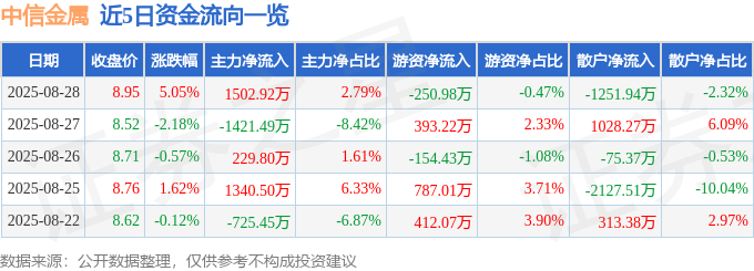 证券之星消息,截至2025年8月28日收盘,中信金属(601061)报收于8.95元,上涨5.05%,换手率11.99%,成交量60.07万手,成交额5.39亿元。