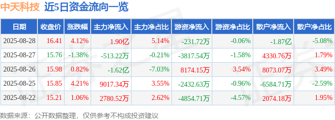 证券之星消息,截至2025年8月28日收盘,中天科技(600522)报收于16.41元,上涨4.12%,换手率6.65%,成交量226.82万手,成交额36.88亿元。