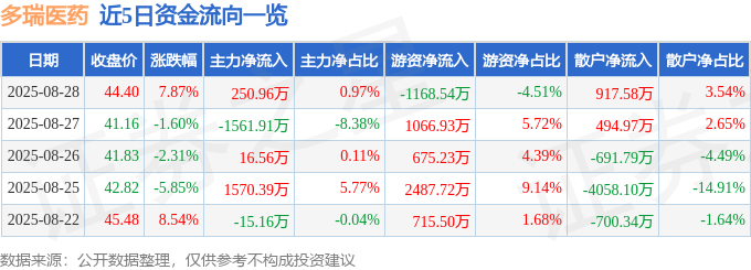 证券之星消息,截至2025年8月28日收盘,多瑞医药(301075)报收于44.4元,上涨7.87%,换手率7.42%,成交量5.94万手,成交额2.59亿元。