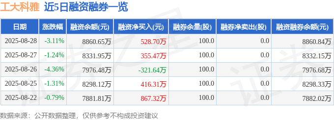工大科雅融资融券信息显示,融资方面,当日融资买入1863.33万元,融资偿还1334.64万元,融资净买入528.7万元。融券方面,融券卖出0.0股,融券偿还0.0股,融券余量100.0股,融券余额0.19万元。融资融券余额8860.84万元。