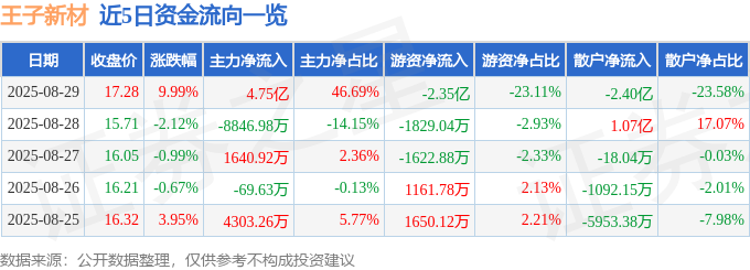 证券之星消息,截至2025年8月29日收盘,王子新材(002735)报收于17.28元,上涨9.99%,涨停,换手率21.19%,成交量59.45万手,成交额10.18亿元。