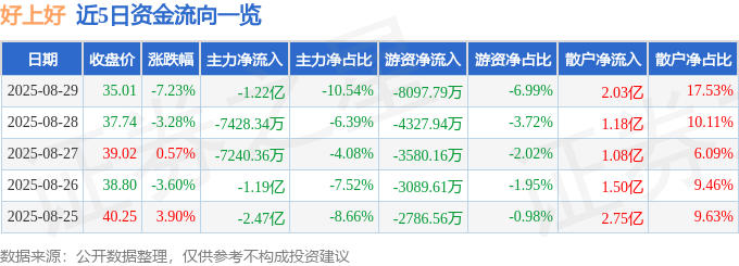 证券之星消息,截至2025年8月29日收盘,好上好(001298)报收于35.01元,下跌7.23%,换手率21.2%,成交量32.66万手,成交额11.58亿元。
