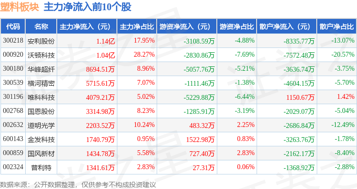 从资金流向上来看,当日塑料板块主力资金净流入1.01亿元,游资资金净流出4037.57万元,散户资金净流出6048.88万元。塑料板块个股资金流向见下表: