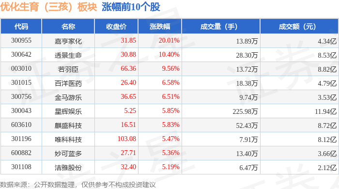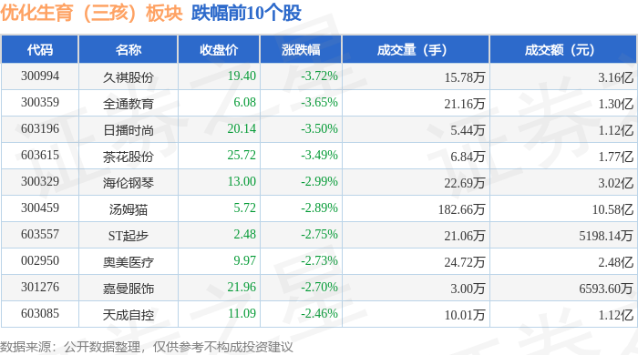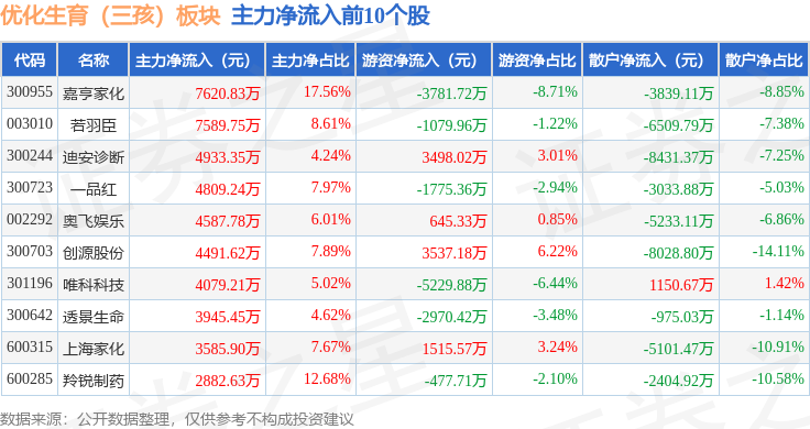 从资金流向上来看,当日优化生育(三孩)板块主力资金净流出11.15亿元,游资资金净流入2.11亿元,散户资金净流入9.04亿元。优化生育(三孩)板块个股资金流向见下表:
