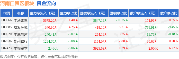 从资金流向上来看,当日河南自贸区板块主力资金净流出2.0亿元,游资资金净流出95.14万元,散户资金净流入2.01亿元。河南自贸区板块个股资金流向见下表: