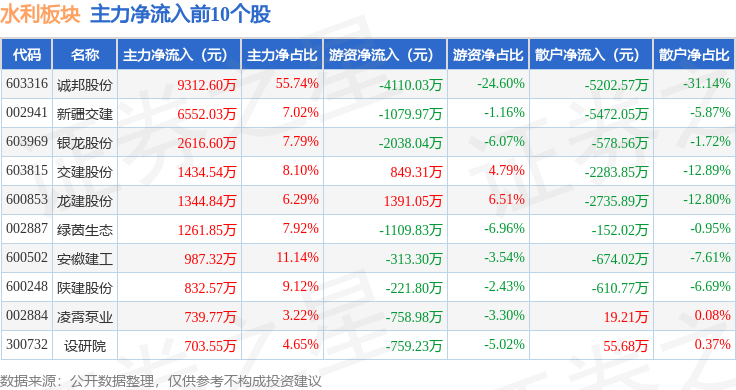 从资金流向上来看,当日水利板块主力资金净流出25.31亿元,游资资金净流入7.33亿元,散户资金净流入17.98亿元。水利板块个股资金流向见下表: