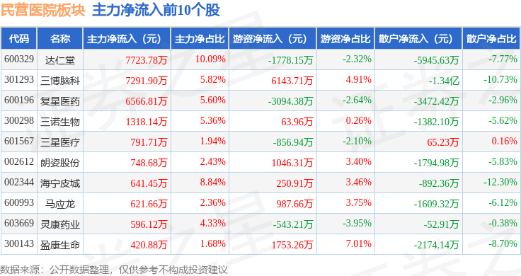 从资金流向上来看,当日民营医院板块主力资金净流出5.02亿元,游资资金净流入2.63亿元,散户资金净流入2.39亿元。民营医院板块个股资金流向见下表: