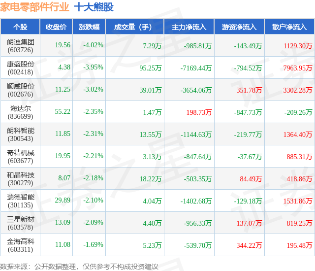 个股表现方面,家电零部件行业当日领跌股为朗迪集团(603726),该股当日报收19.56,下跌4.02%,成交量7.29万,主力资金净流出985.81万元。康盛股份(002418)以下跌3.95%紧随其后,该股当日成交量95.25万,主力资金净流出7169.44万元。除此之外,顺威股份(002676)、海达尔(836699)、朗科智能(300543)均进入当日熊股之列。具体个股列表见下表: