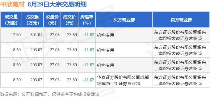 证券之星消息,8月29日中欣氟材发生大宗交易,交易数据如下: