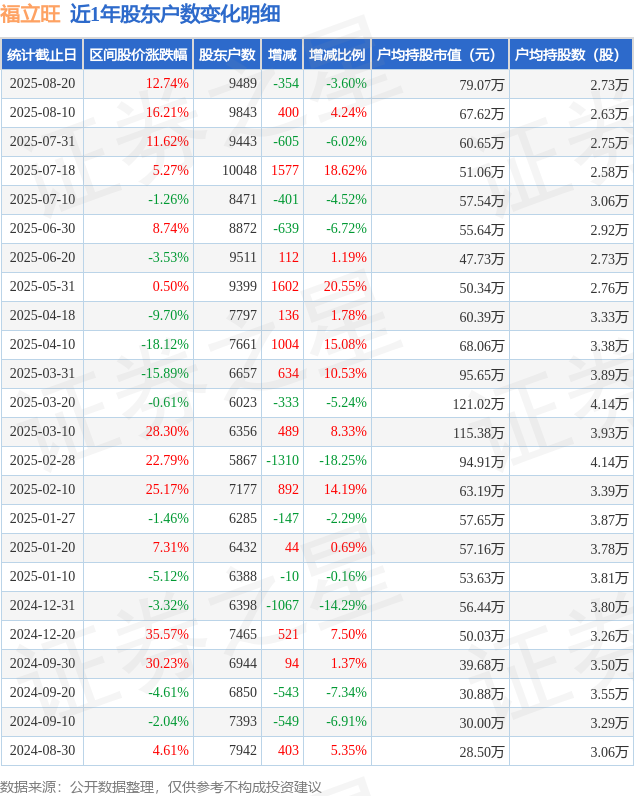 从股价来看,2025年8月10日至2025年8月20日,福立旺区间涨幅为12.74%,在此期间股东户数减少354.0户,减幅为3.6%。
