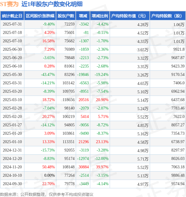 从股价来看,2025年7月18日至2025年7月31日,ST赛为区间跌幅为9.4%,在此期间股东户数减少3342.0户,减幅为4.42%。