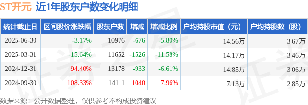 从股价来看,2025年3月31日至2025年6月30日,ST开元区间跌幅为3.17%,在此期间股东户数减少676.0户,减幅为5.8%。