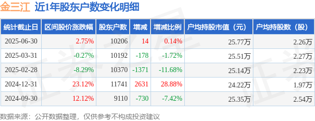 从股价来看,2025年3月31日至2025年6月30日,金三江区间涨幅为2.75%,在此期间股东户数增加14.0户,增幅为0.14%。