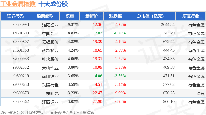 工业金属(980043)指数十大成份股详情如下: