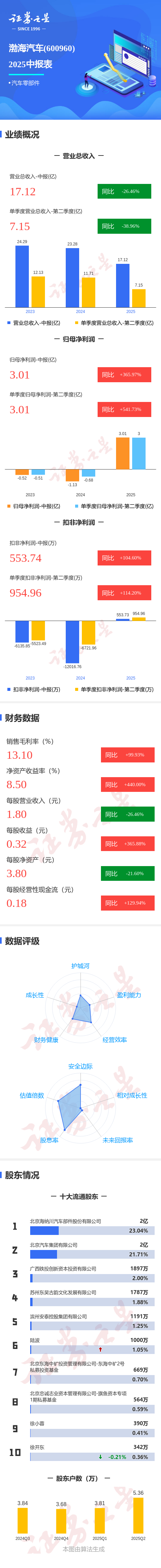 证券之星消息,渤海汽车2025年中报显示,公司主营收入17.12亿元,同比下降26.46%;归母净利润3.01亿元,同比上升365.97%;扣非净利润553.74万元,同比上升104.61%;其中2025年第二季度,公司单季度主营收入7.15亿元,同比下降38.97%;单季度归母净利润3.01亿元,同比上升541.74%;单季度扣非净利润954.96万元,同比上升114.21%;负债率41.07%,投资收益3.83亿元,财务费用-1016.8万元,毛利率13.1%。
