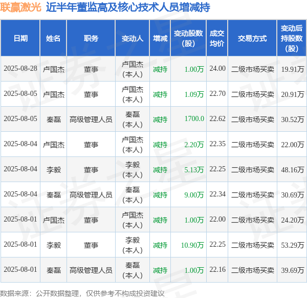 联赢激光近半年内的董监高及核心技术人员增减持详情如下: